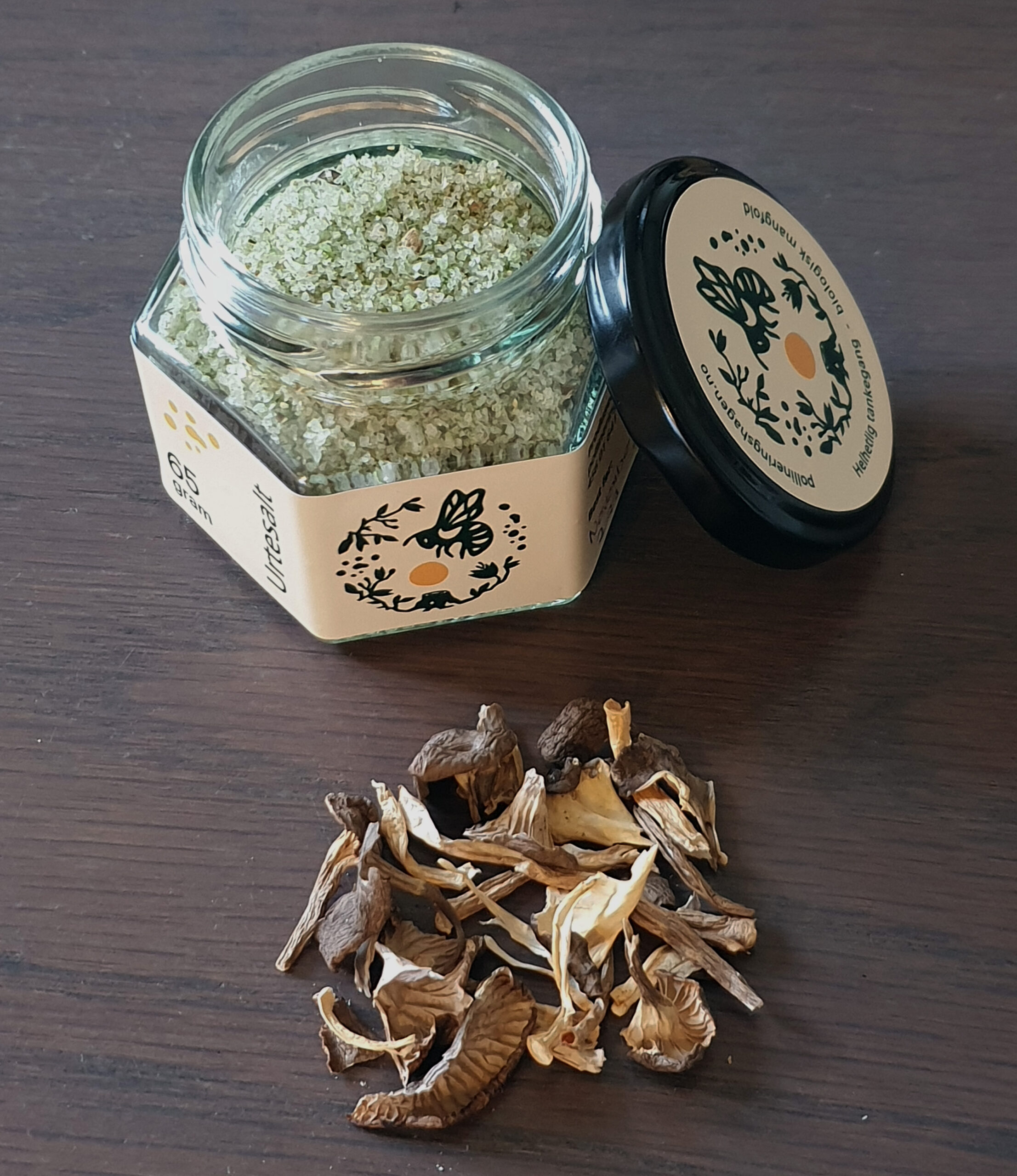 Soppsaltet består av traktkantarell, persille* og hvitløk*. Traktkantarell høster vi selv i skogene i nærmiljøet og persille og hvitløk er dyrket på økologisk vis i Pollineringshagen på Ekerhovd.